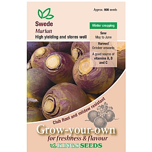 Swede Marian is an old favourite, producing heavy yields of purple skinned roots with orange flesh. Shows good resistance to Club Root and mildew. Stores well.