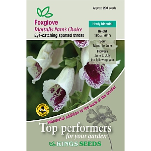Foxglove Digitalis Pam`s Choice has impressive white blooms with solid dark red blotches in the throat. Ideal for adding height and interest to beds and borders. Toxic if eaten. Flowers the year after sowing. Height 160cm. Hardy biennial.